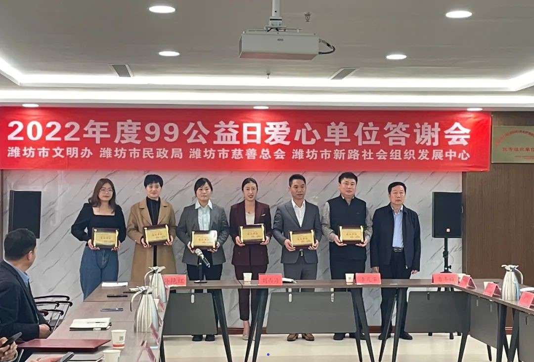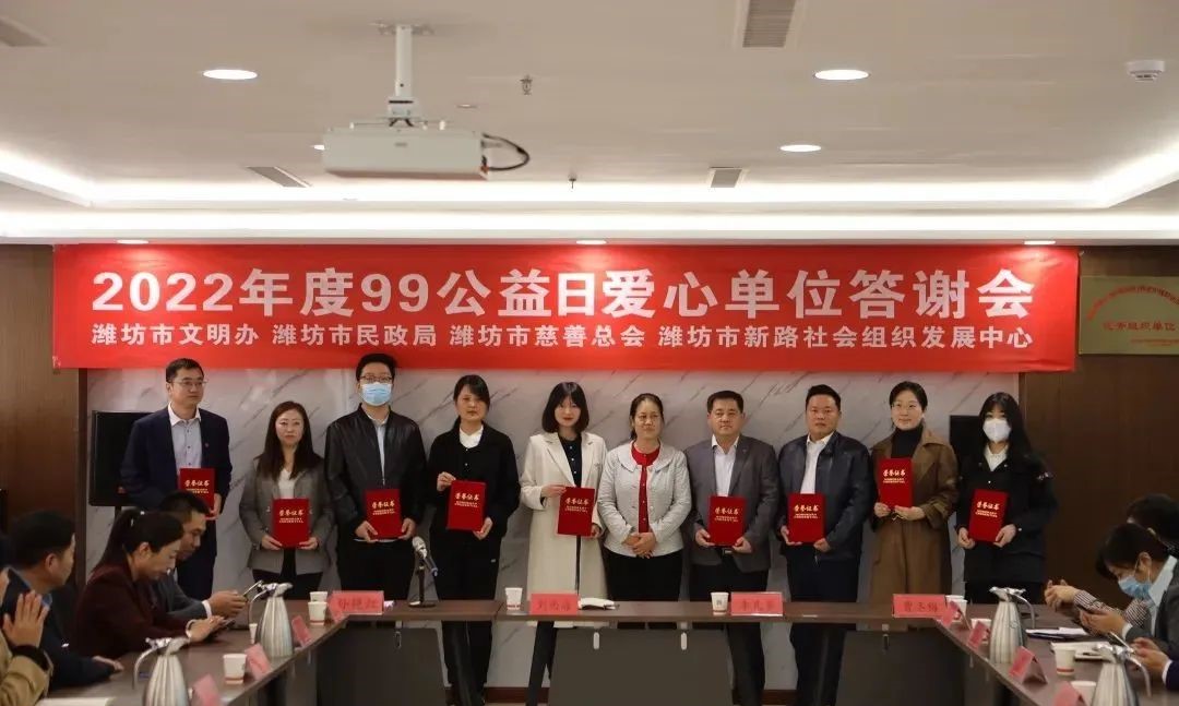 2022年10月13日上午,山東省安全產(chǎn)業(yè)協(xié)會以及會長單位濰坊市平安消防工程有限公司受邀參加由濰坊市文明辦、濰坊市民政局、濰坊市慈善總會、濰坊市新路社會組織發(fā)展中心舉辦的2022年度99公益日愛心單位答謝會活動。出席本次答謝會領(lǐng)導有: